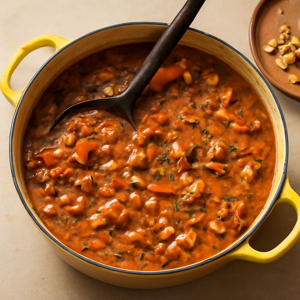 The defining combination in west african peanut stew is roasted peanuts or natural peanut butter paired with tomatoes. The peanuts add fat, protein, and a deep nuttiness that carries other spices well. Crushed or pureed tomatoes add acidity and color. Together they form a thick, complex base unlike any European stew tradition.